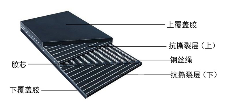 防撕裂鋼絲繩芯輸送帶采用橫向添加增強材料,克服了一般鋼絲繩芯輸送帶易縱向撕裂的缺點,有效地避免了使用過程中的輸送帶撕裂現象的發生。從而其帶兼備普通鋼絲繩芯輸送帶與織物芯分層輸送帶的優點,具有較高的緯向抗拉強度、較低的使用延伸率。
